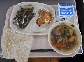 サラダのほうれん草と肉うどんのつけ汁に入っているねぎも深谷産です。