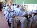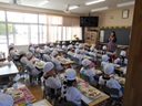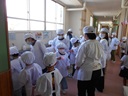 6年生のお兄さん、お姉さんから給食の準備の仕方や配膳を教えてもらっていました。