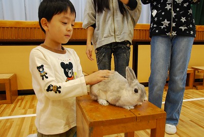 動物に関するクイズ、ウサギの抱き方の実演、