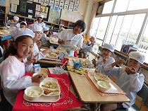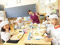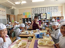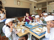授業後には、3年生のクラスで給食を一緒に食べました。