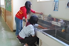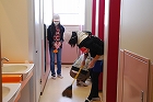 6年生のお兄さん、お姉さんから給食の準備の仕方や配膳を教えてもらっていました。
