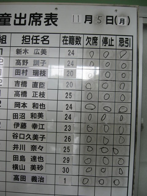 職員室の廊下にある出席表には