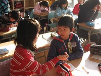 6年生のお兄さん、お姉さんから給食の準備の仕方や配膳を教えてもらっていました。
