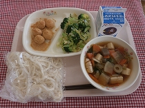 岡部西小学校では「とり肉・豆腐・ニンジン・こまつな