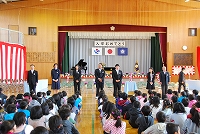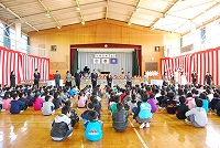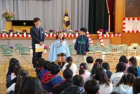 旧担任に付き添われて、体育館に新2年から新6年生がそろいました。