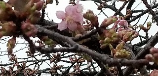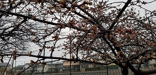 今朝、校庭の河津桜が一輪、開花していることに気がつきました。