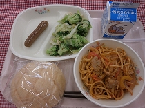 今日は、メロンパンや焼きウインナーが給食に