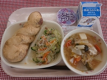 キムチ鍋は、給食室で手作りした鶏肉団子が
