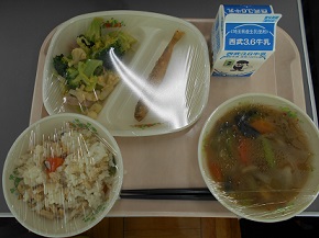給食では、酢飯にだし汁で煮た野菜などの具材を混ぜ込んでいます。