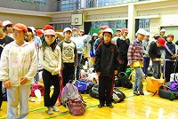 バスから降りてきた子どもたちは、お互いの荷物を持ち合い、