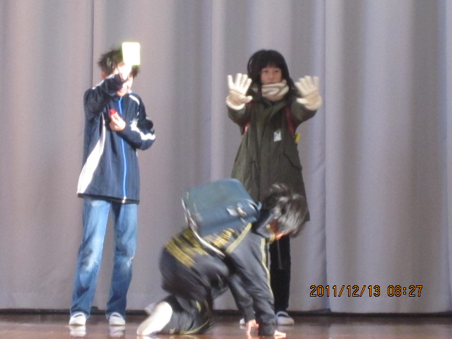 寒い時期の登下校の様子を振り返る「寸劇」