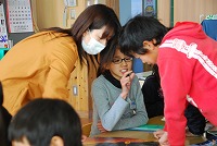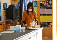 6年生のお兄さん、お姉さんから給食の準備の仕方や配膳を教えてもらっていました。
