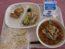 サンマーメンは神奈川のご当地ラーメンとして知られていますが、給食ではもやしをはじめとした野菜を醤油で味付け、とろみを付けています。具だくさんの汁に仕上がりました。