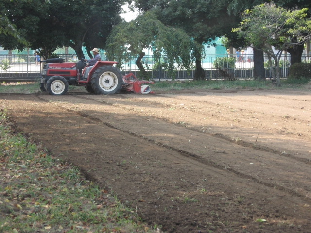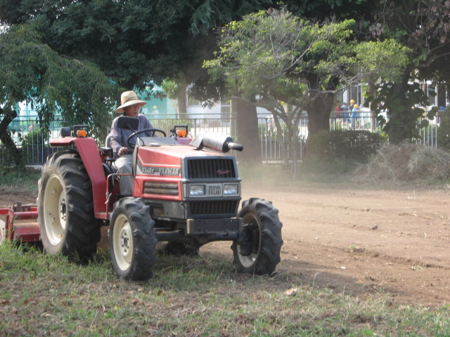 体育館前の畑に、赤い耕運機がやってきました。