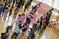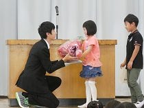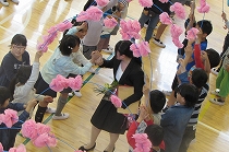 3月で岡部西小学校を去られた先生方をお迎えし、感謝の気持ちを伝えるため、校歌や手紙、そしてお花を渡しました。