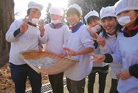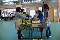 6年生のお兄さん、お姉さんから給食の準備の仕方や配膳を教えてもらっていました。