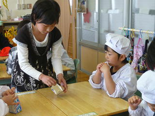 片付けでは、これも初めての牛乳パックを開く作業があります。