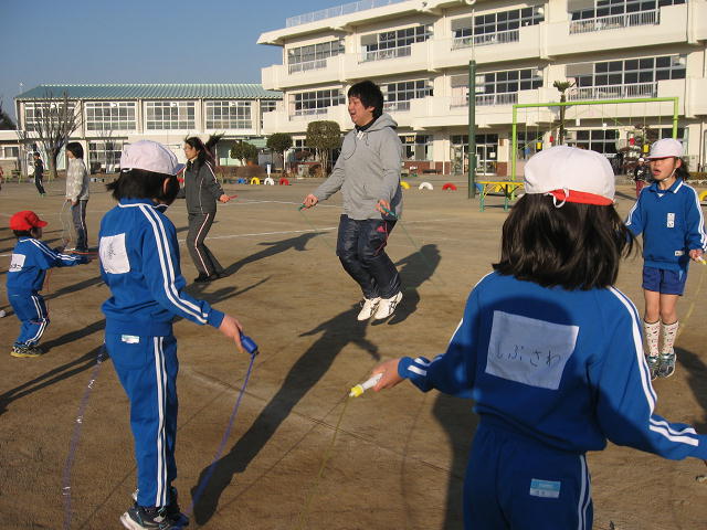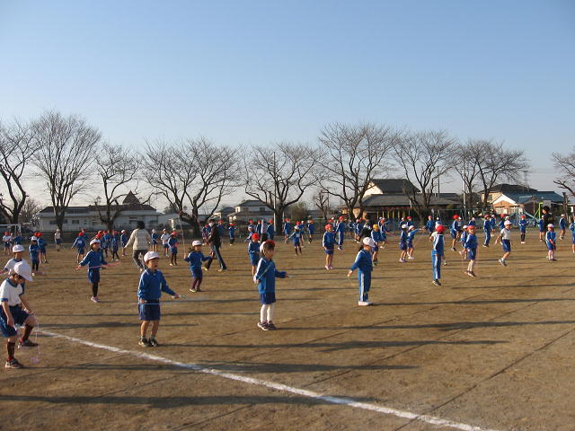 流れる曲に合わせて全校で縄跳びに挑戦です。