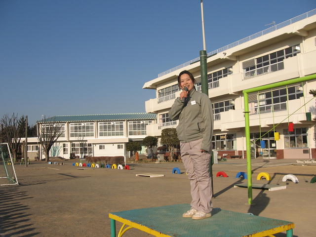 スポーツタイムの後に全校児童にあいさつをしました。