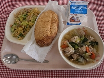 白菜と肉だんごのスープの肉だんごは給食室で一つ一つ心を込めて手作りしました。具だくさんで、栄養たっぷりのスープになっています。