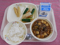 今日の給食は、なすを使った麻婆豆腐です。