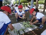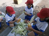朝採りのとうもろこしを、1年生が皮を剥いて