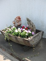 小人さんのプランターに、新しく紅白の日々草が植えられました。