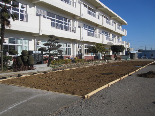 校舎南側のアスファルトの中央部分が緑の芝生へと変わります。